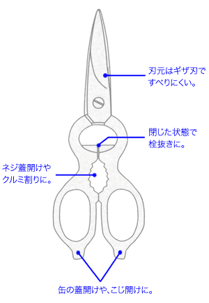 カニ料理や魚の骨切り、栓抜き、クルミ割り、缶のこじ開けなどにご使用できます。