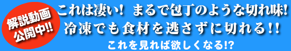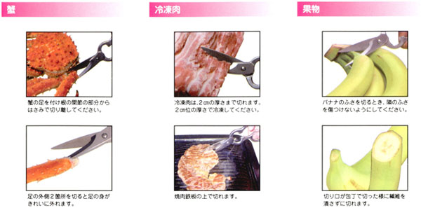 従来のキッチン鋏では、どんなに切れ味のよいものでも、冷凍食品や魚の骨等の堅いものは逃げてしまいましたが、そういった食材も逃がすことなく、楽に切ることができます。また、バナナ等の柔らかいものも、繊維を潰さず、包丁で切った様な滑らかな切口となります。