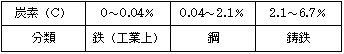 こんなに有用な鋼でも、その生まれを洗えば、ナマクラな鉄や脆いズク鋳物、つまり鍋や釜の鋳物と同じ兄弟分であって、その血統は鉄(Fe)と炭素(C)の合金です。つまり、Cが0のものが鉄(Fe)、Cが多からず、少なからず適当に入っているものが鋼、多すぎるくらいに入っているものが鋳物(鋳鉄)ということになります。FeにCが混ざる割合で、鉄、鋼、鋳鉄の区別ができるのです。その分量はどれくらいかというと下記のようになります。